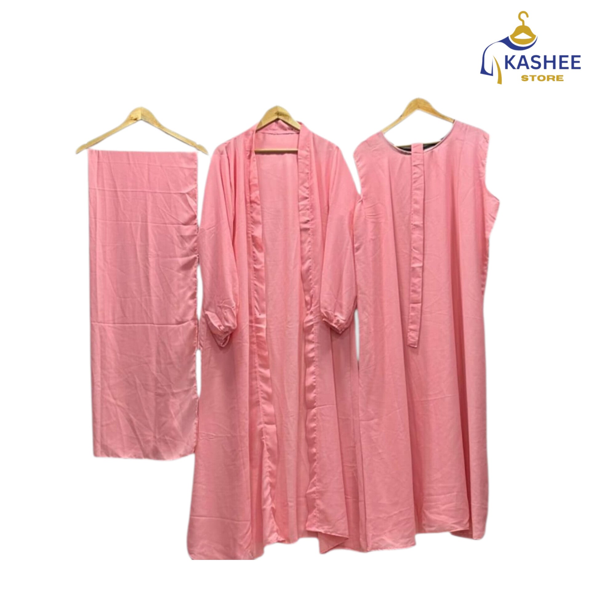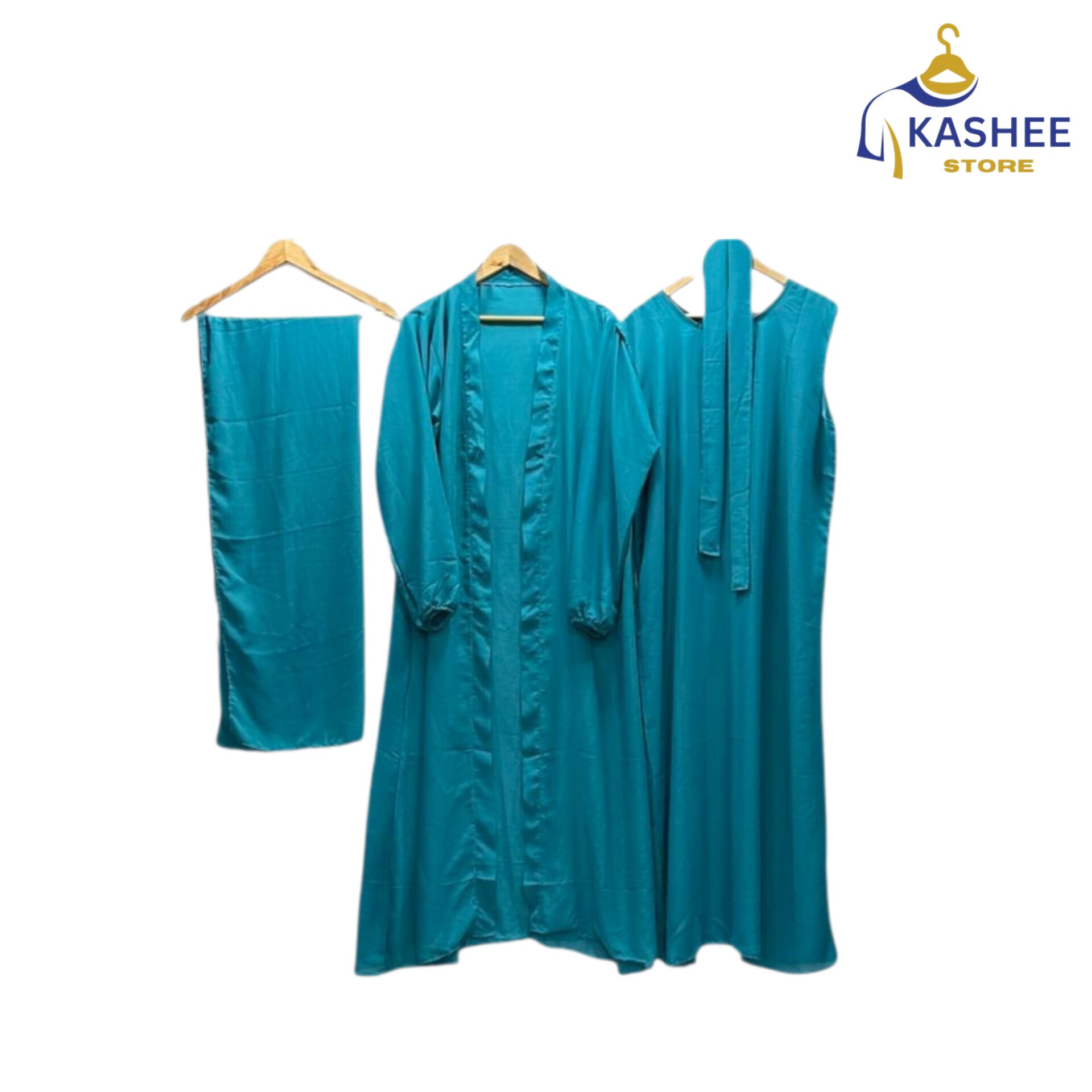 Upgrade your modest wardrobe with this elegant 4-piece Inner Gown Abaya Set, crafted from premium dual georgette fabric – lightweight, breathable, and perfect for summer wear.